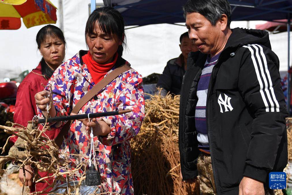 3月19日,在安仁县中草药交易集市,商家(中)为消费者挑选的中草药称重。