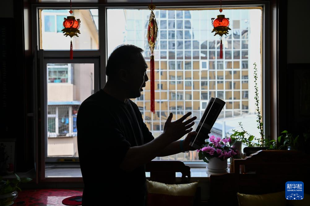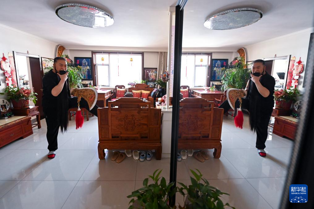 武凌云在位于太原市杏花岭区的家中为演出做准备(3月26日摄)。