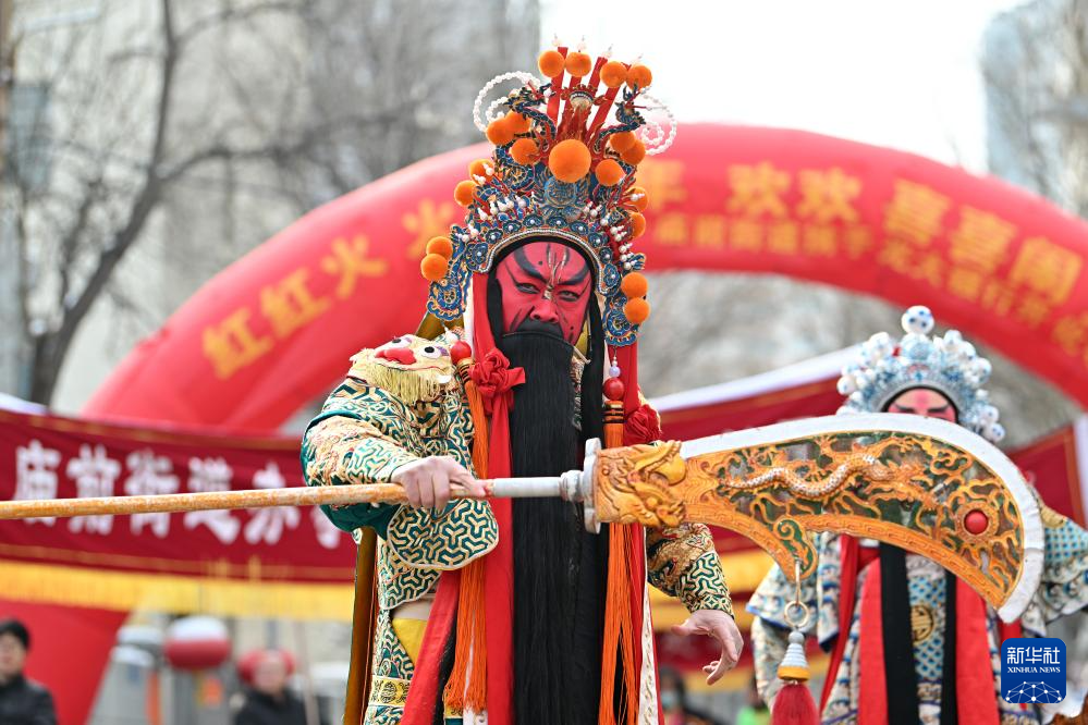 在太原市迎泽区庙前街,扮演关公的武凌云在文化展演活动上表演(2月23日摄)。
