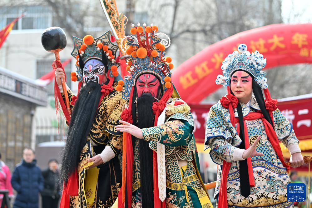 在太原市迎泽区庙前街,扮演关公的武凌云(中)和扮演关平的王胜军(右)、扮演周仓的程利恒(左)在文化展演活动上表演(2月23日摄)。