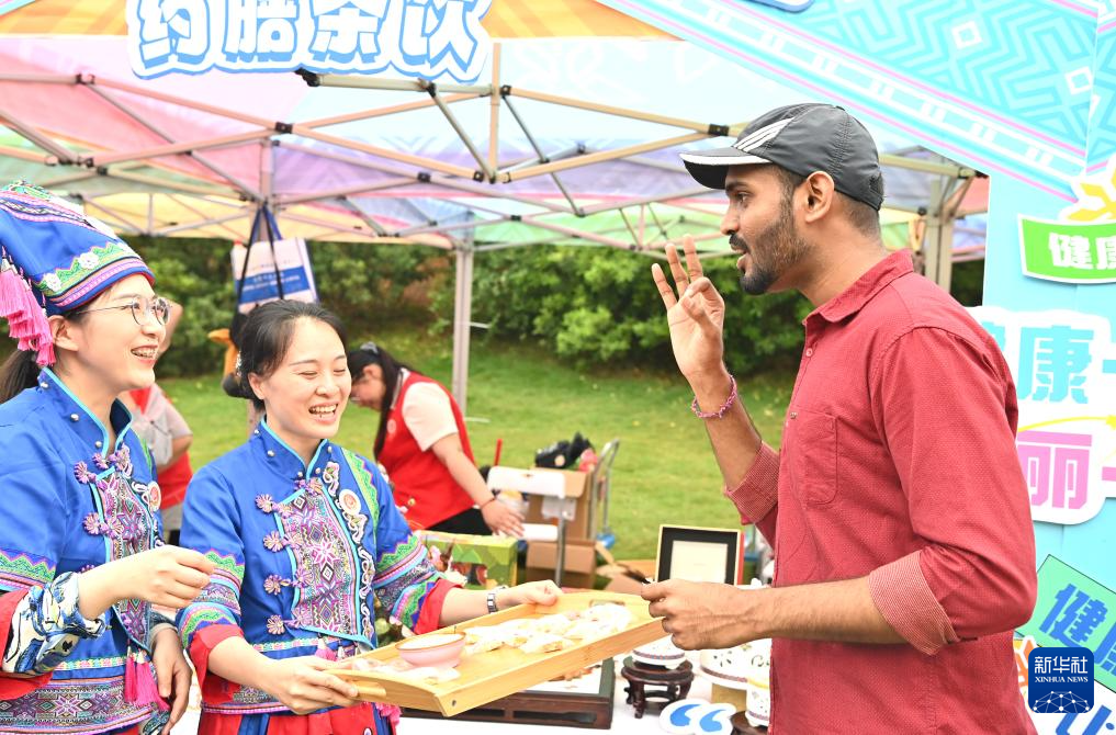 4月11日,一名外国游客在广西南宁市青秀山主会场品尝美食后做出“OK”手势。