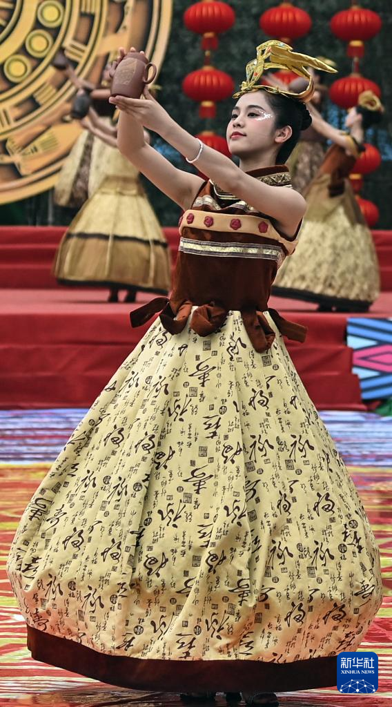 4月11日,在广西钦州市庆祝“三月三”的实景演出现场,演员在展示钦州坭兴陶艺品。
