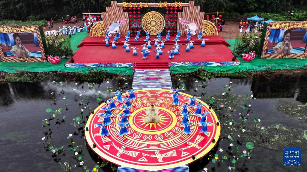 4月11日,广西钦州市在钦北区贵台镇八寨原乡洞利江边举办实景演出活动,庆祝“三月三”传统佳节(无人机照片)。