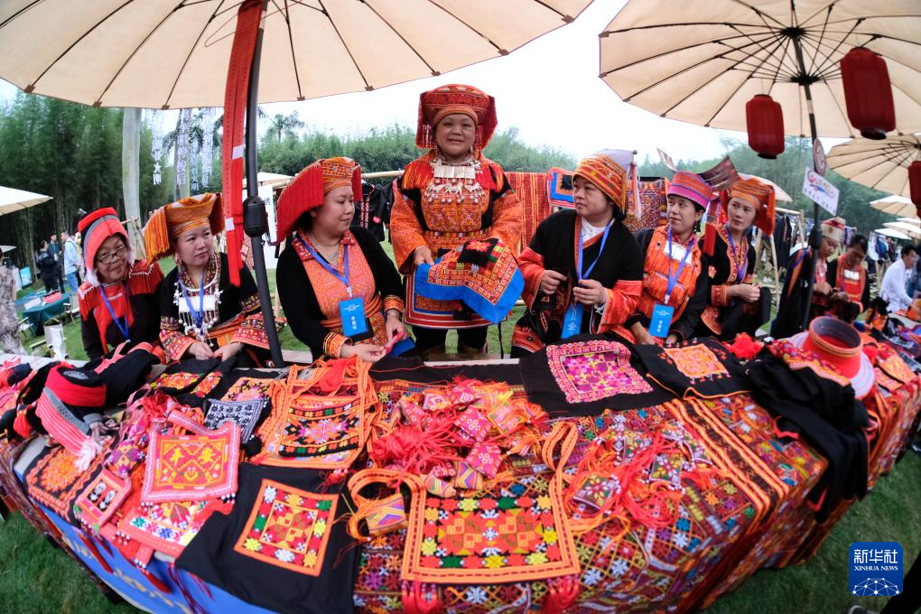 4月11日,瑶族绣娘在广西南宁市青秀山主会场展示瑶绣。