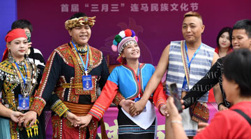 4月11日,台湾同胞在首届“三月三”连马民族文化节上表演高山族舞蹈。