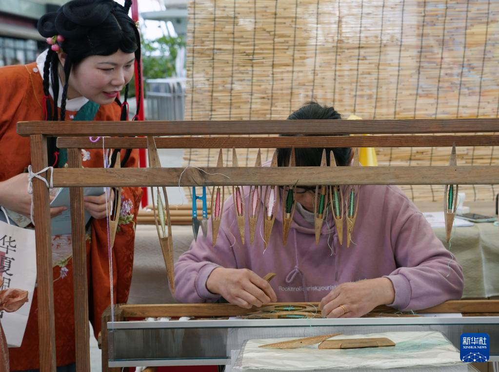 4月11日拍摄的国风市集上的缂丝织造工艺展示。