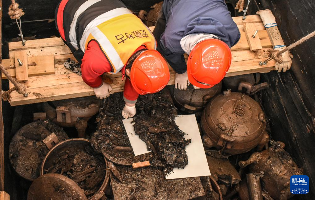 考古工作者在安徽淮南武王墩主墓内提取脆弱的文物(2024年4月6日摄)。