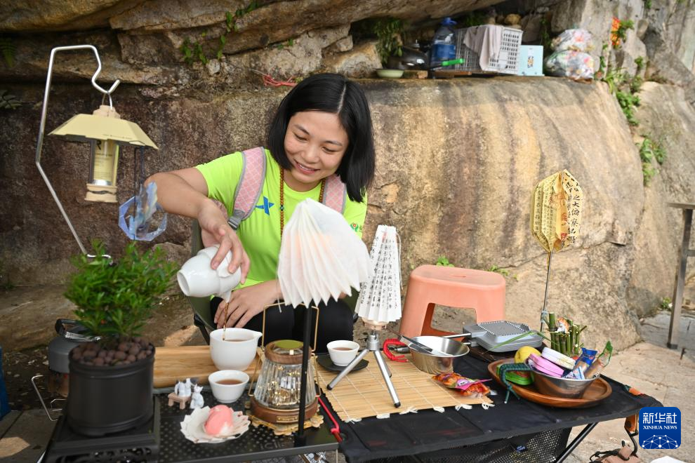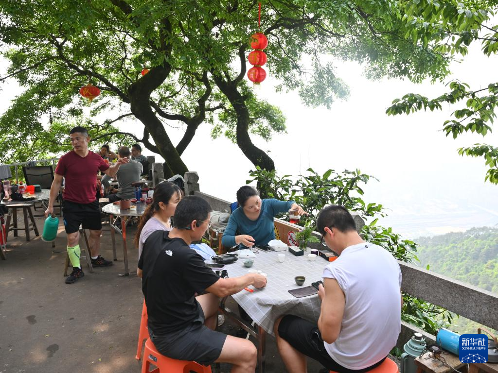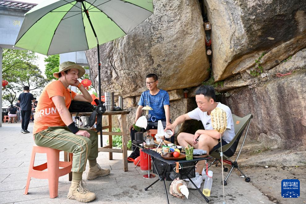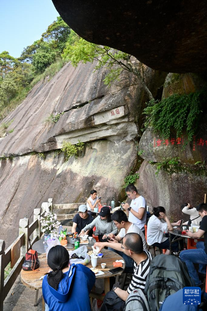4月14日,在福州鼓山白云洞景点,登山爱好者在此停歇饮茶。