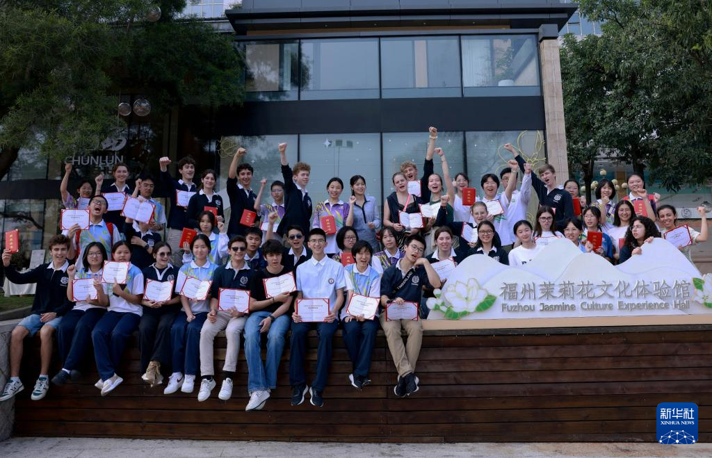 4月14日,在福州茉莉花文化体验馆,福州外国语学校与姊妹校巴黎斯坦尼斯学校的师生合影留念。