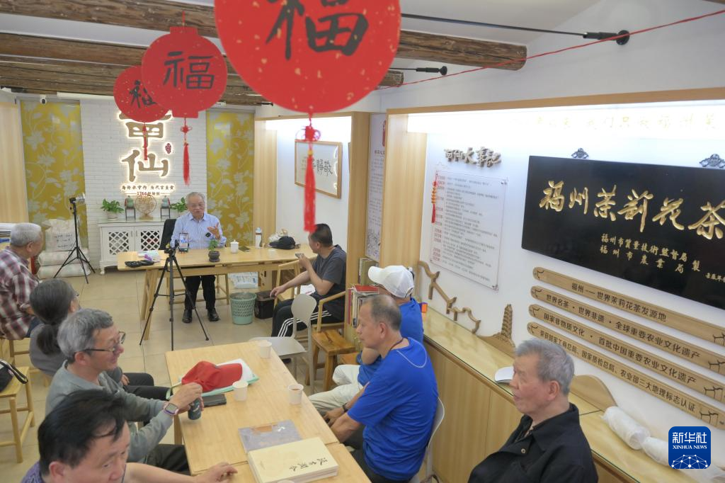 4月14日,福州民俗专家、闽都乡学讲习中心讲师方琪(中)在福州大众茶馆“南仙茶摊”为群众开展“福山福水福文化”讲座。