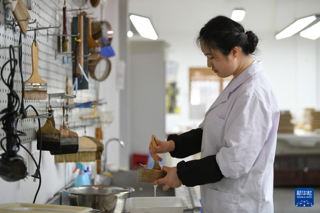 在四川西部文献修复中心,唐陈韵将修复用的托纸上墙晾干(4月19日摄)。