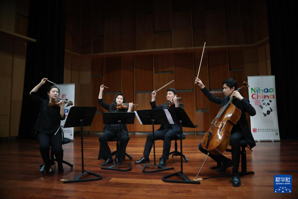4月26日晚,中国知名弦乐四重奏——中国中央音乐学院琥珀四重奏,在新西兰克赖斯特彻奇市中心音乐厅演出,为观众带来一场中西融合的听觉盛宴。新华社发(孟韬 摄)