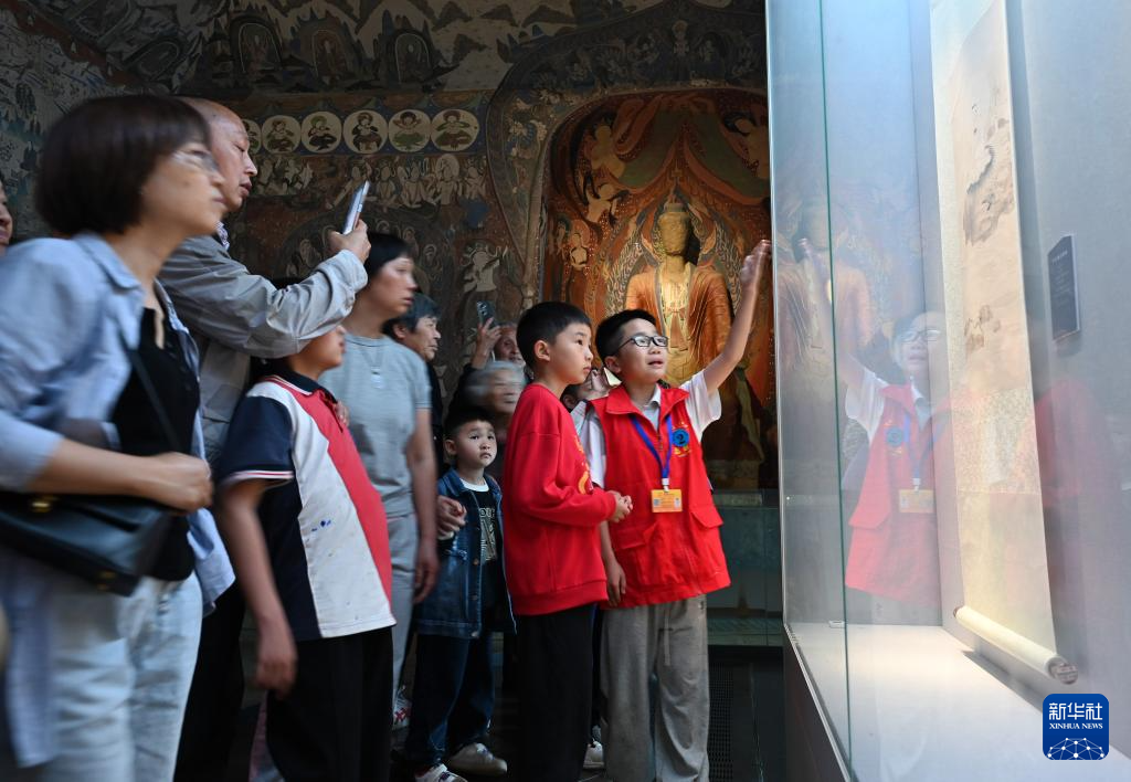 5月1日,“小小讲解员”在四川省内江市张大千博物馆为游客义务讲解。
