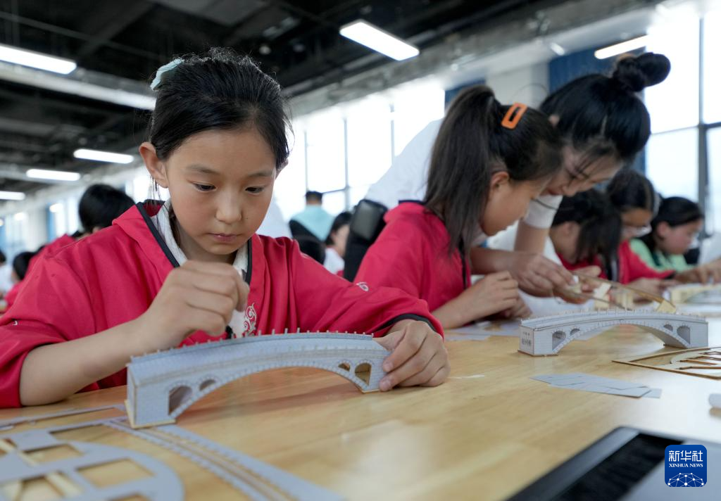 赵县北王里镇中心小学的学生在研学课上手工制作赵州桥模型(4月25日摄)。