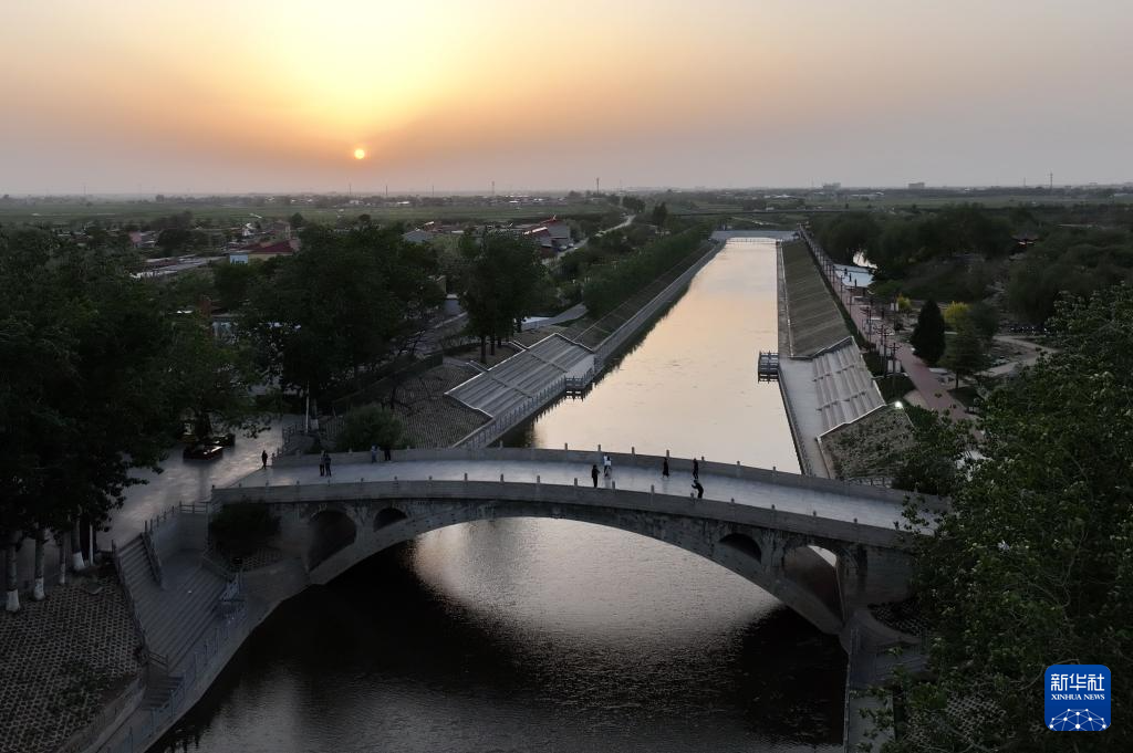 日落时分的赵州桥(4月24日摄,无人机照片)。