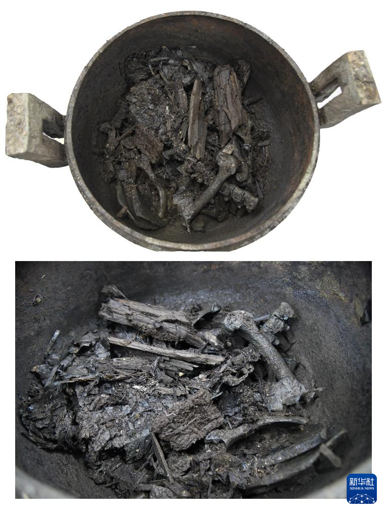 武王墩墓出土的铜鼎及其内部猪骨出土状况(5月15日摄)。新华社发