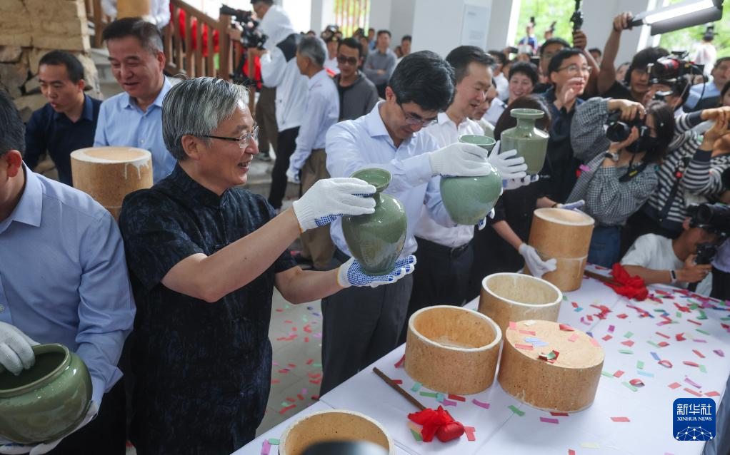 6月6日,在慈溪市上林湖青瓷传承园举行的开窑仪式上,嘉宾们把越窑青瓷从匣钵内取出。
