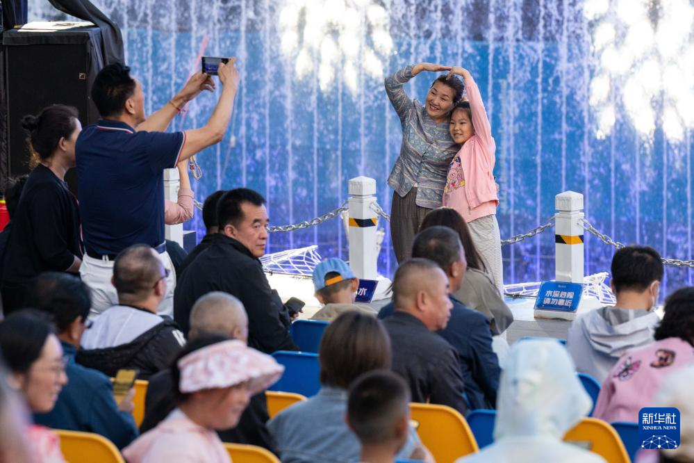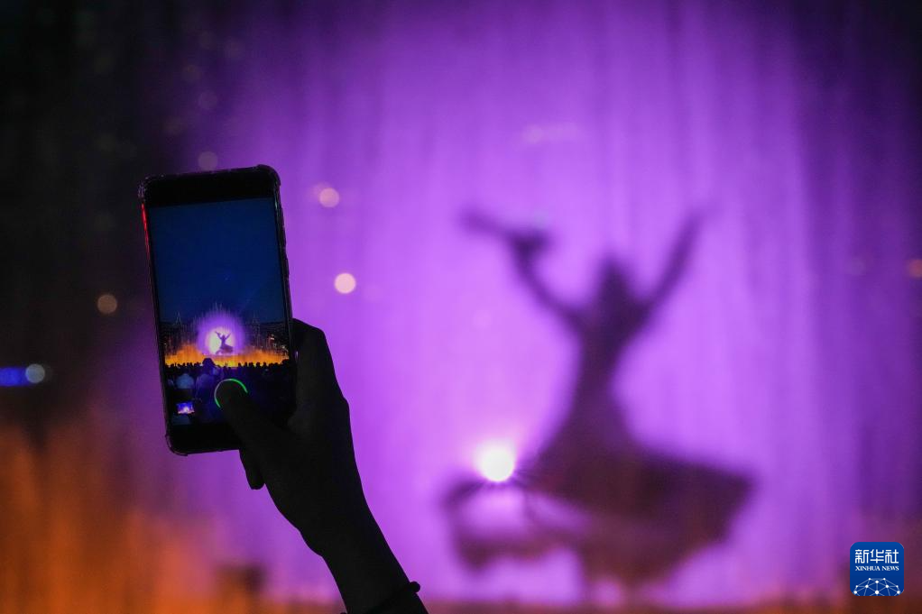 6月10日,观众在用手机拍摄《遇见·哈尔滨》演出现场的水幕舞台效果。