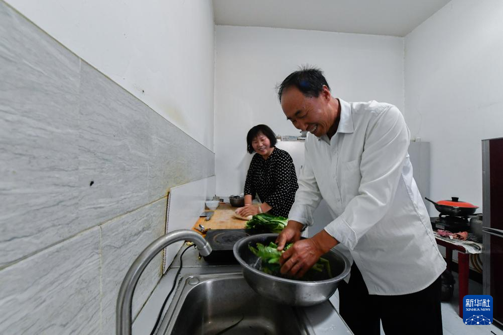 7月16日,张吉全和闻春瑜在厨房洗菜和面准备做饭。