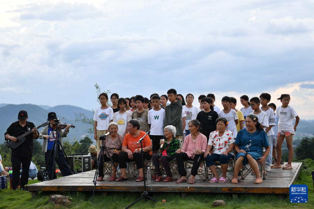 8月25日,孩子们和村里老人在大元社乡村青少年艺术节上演唱童谣。