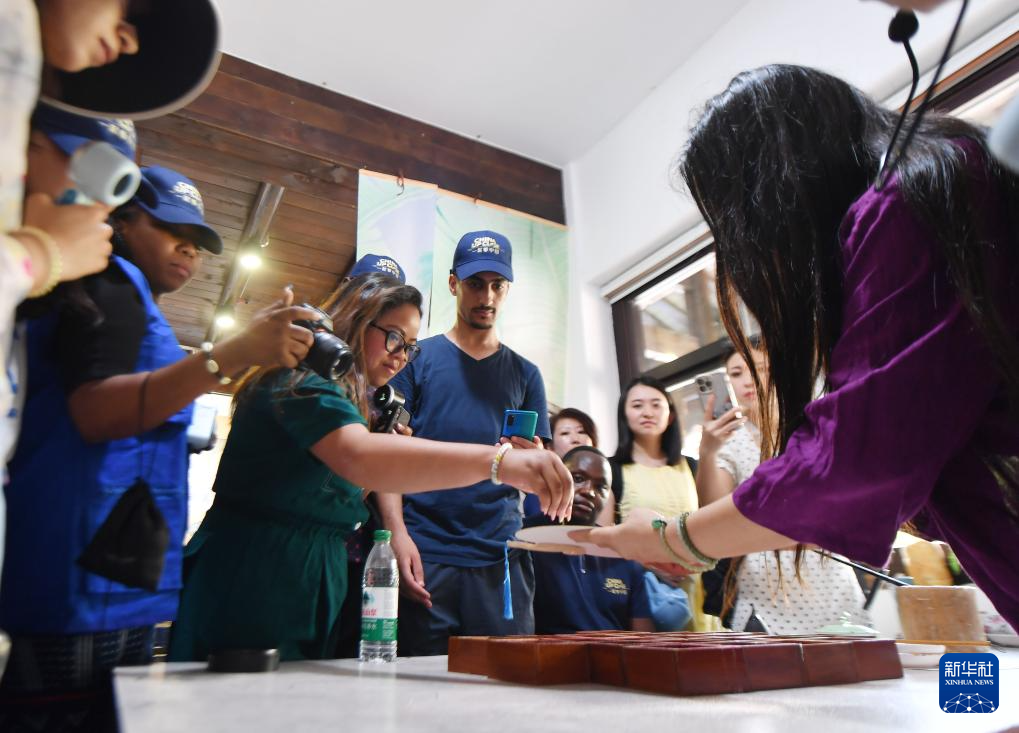 9月3日,在常德河街,外国游客体验非遗美食擂茶的制作。