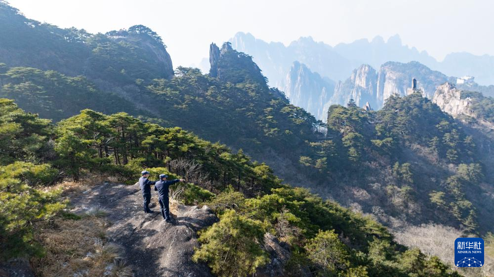 12月18日,黄山风景区管委会园林局瞭望哨防火小队队员在景区巡查(无人机照片)。