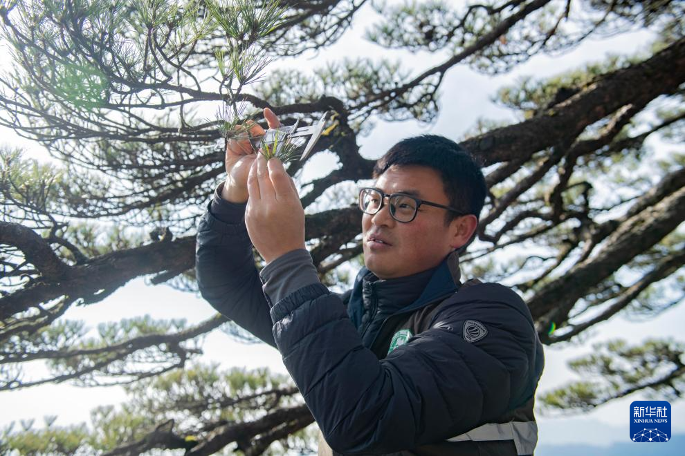 12月18日,黄山风景区管委会园林局高级工程师吴贻军用游标卡尺测量迎客松松针长度。