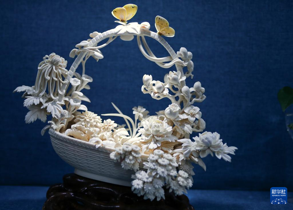 李春珂设计制作的牙雕花篮(猛犸象牙)(12月17日摄)。