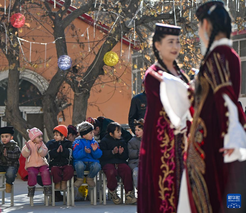 村民在大同乡阿依克日克村小广场上观看由大同乡库如克兰干村小朋友表演的舞蹈《春天的花》(1月7日摄)。