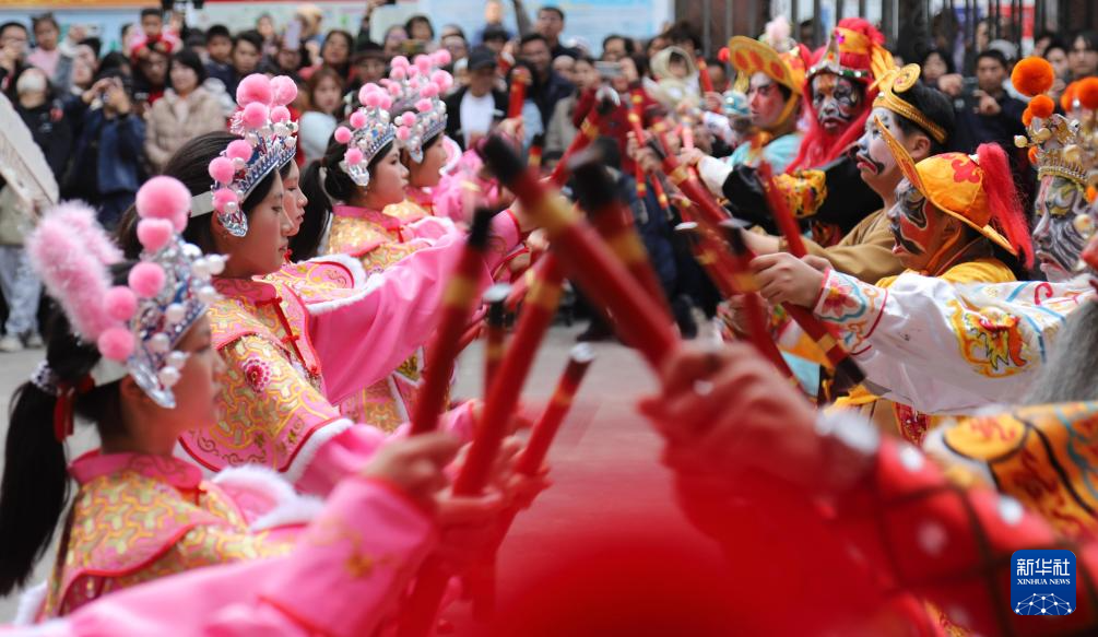 2月2日,英歌队在广东汕头潮阳区“中华英歌 舞动潮阳——2025年春节潮阳英歌嘉年华活动”中表演。
