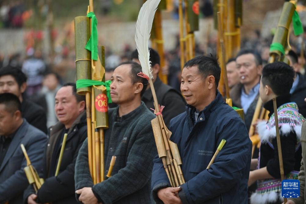 2月5日,人们在融水苗族自治县杆洞乡百鸟衣芦笙坡会上吹芦笙。