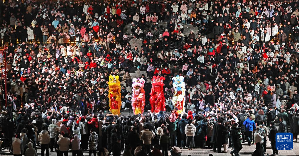 1月29日,游客在山东省临沂市郯城县郯国古城景区观看舞狮表演。