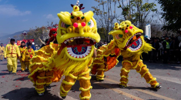 2月6日,人们在南涧县龙灯会上表演舞狮。