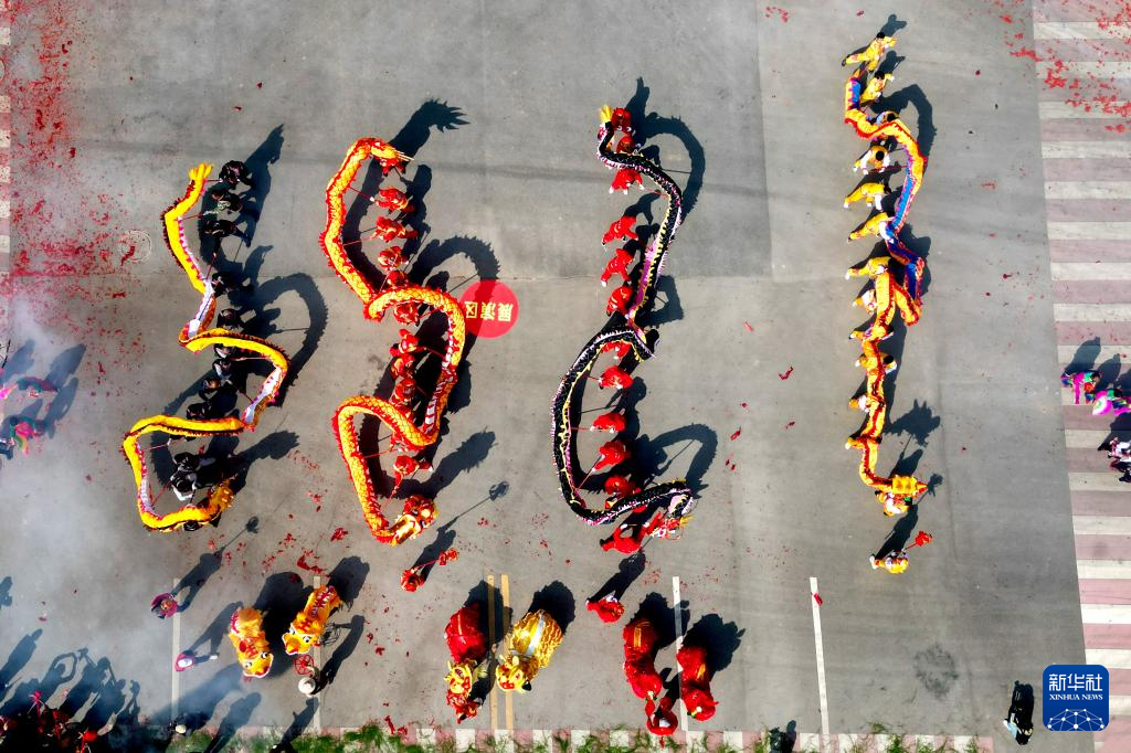 2月6日,人们在南涧县龙灯会上表演舞龙(无人机照片)。