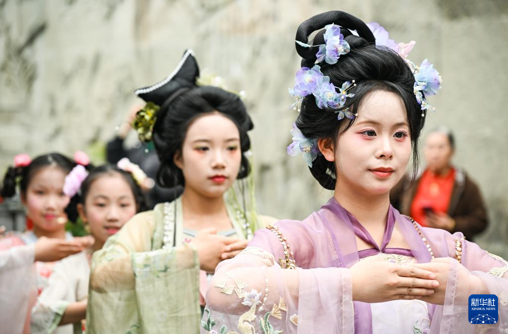 3月22日,小朋友在重庆璧山“儒雅璧韵·璧玉唐礼”传统文化礼仪展示活动现场表演歌舞。