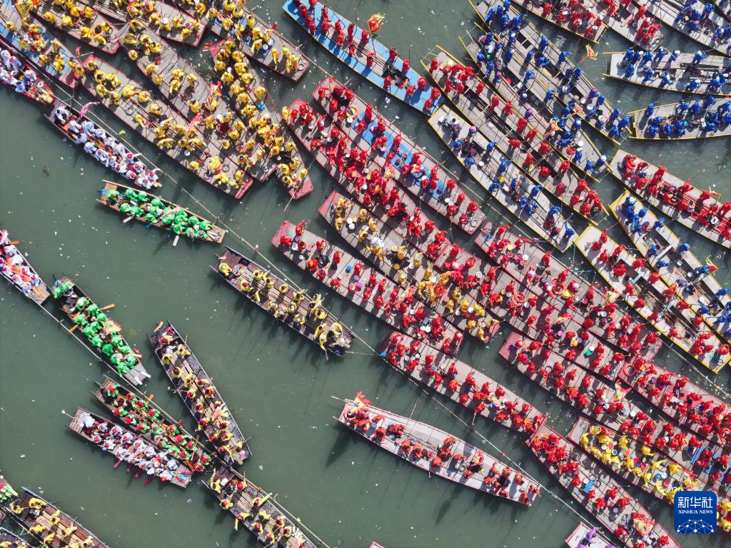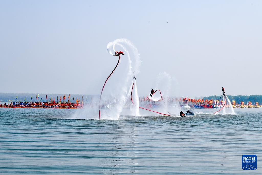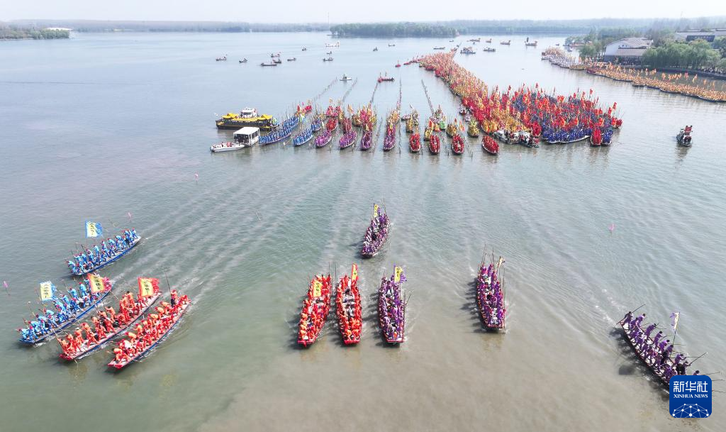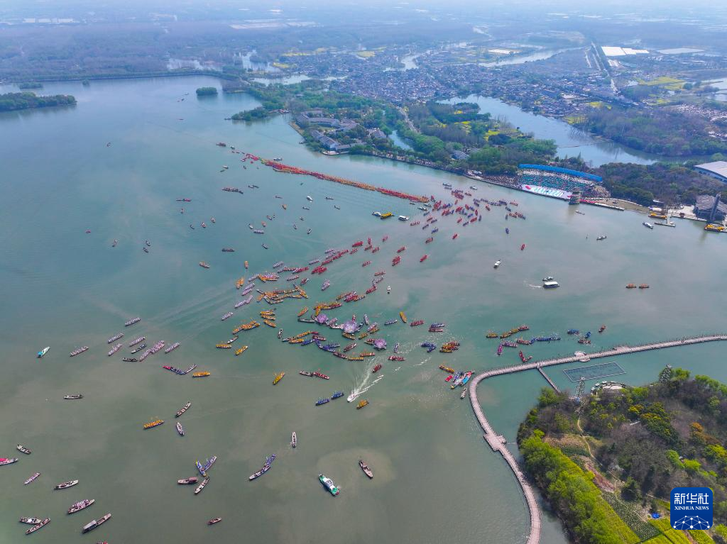 4月6日,龙船行驶在湖面上(无人机照片)。