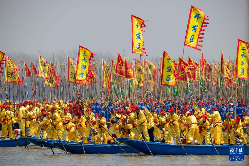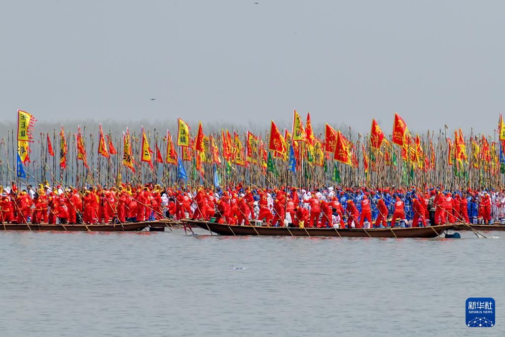 当日,2025泰州姜堰溱潼会船在江苏省泰州市姜堰区溱湖国家湿地公园开幕,五百多条各式船只和上万名会船选手飞篙走桨、弄潮击浪,演绎历久弥新的民俗画卷。