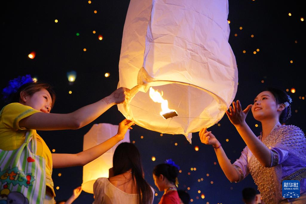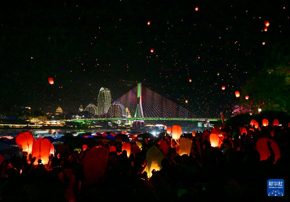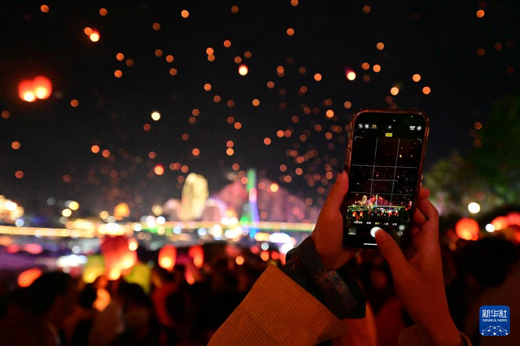 4月13日晚,人们在西双版纳傣族自治州景洪市澜沧江畔放飞孔明灯。