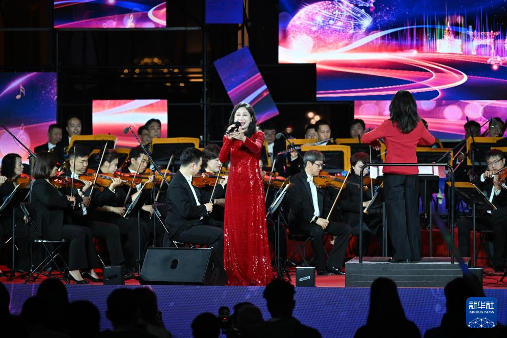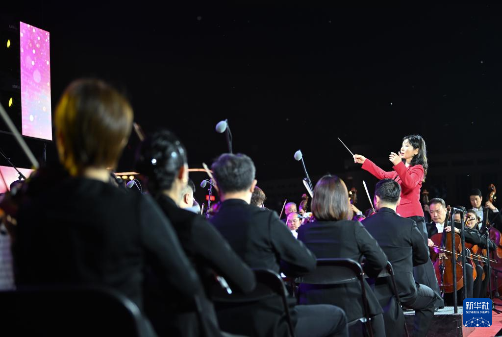 4月19日晚,天津交响乐团常任指挥易娟子在桥边音乐汇演出活动上指挥。