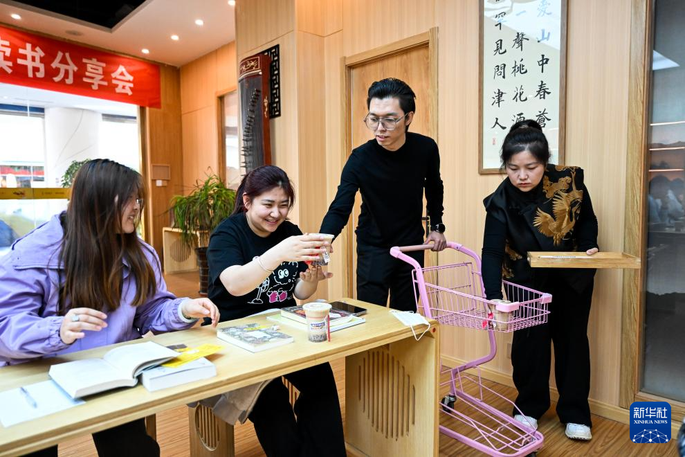4月22日,在乌兰察布市集宁区言知书店,巩懋林(右二)与妻子蒲欣(右一)给参加世界读书日活动的市民送上咖啡。
