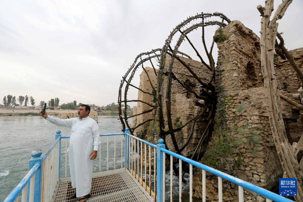 4月21日,人们在伊拉克安巴尔省参观幼发拉底河上的传统水车。