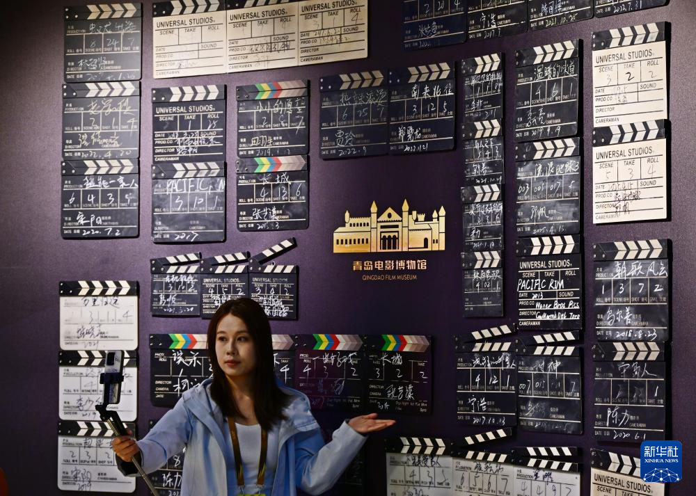 4月28日,观众在青岛电影博物馆电影场记板装饰墙前拍摄。
