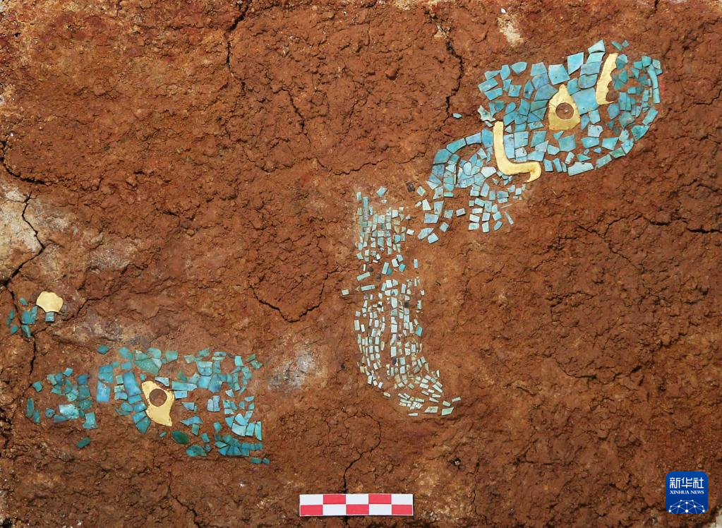 湖北黄陂盘龙城遗址杨家湾M17出土的金片绿松石镶嵌饰(资料照片)。新华社发(全国十大考古新发现活动办公室供图)