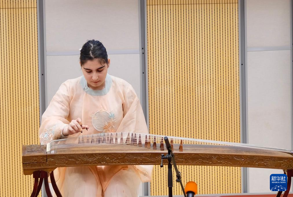 5月22日,在捷克布拉格金融管理大学举行的“汉语桥”世界大学生中文比赛捷克赛区决赛上,一名参赛选手演奏乐器。