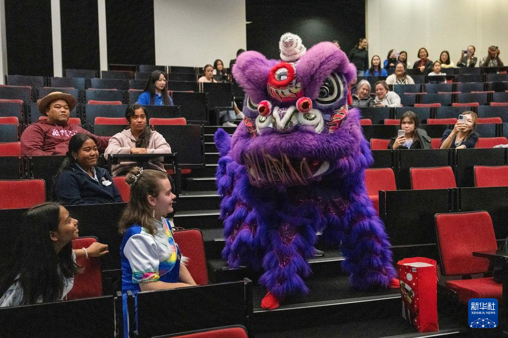 5月24日,在新西兰奥克兰大学举行的“汉语桥”中文比赛上,一名参赛选手表演舞狮。