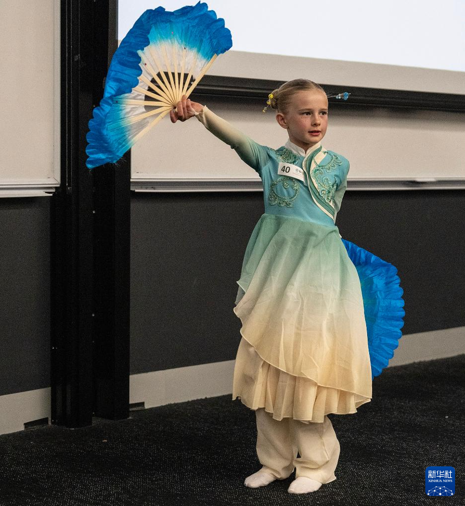 5月24日,在新西兰奥克兰大学举行的“汉语桥”中文比赛上,一名参赛选手表演舞蹈。