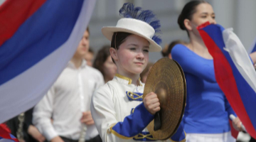 5月31日,一名男孩在香港文化中心露天广场举行的“非遗嘉年华”上体验龙船舞。