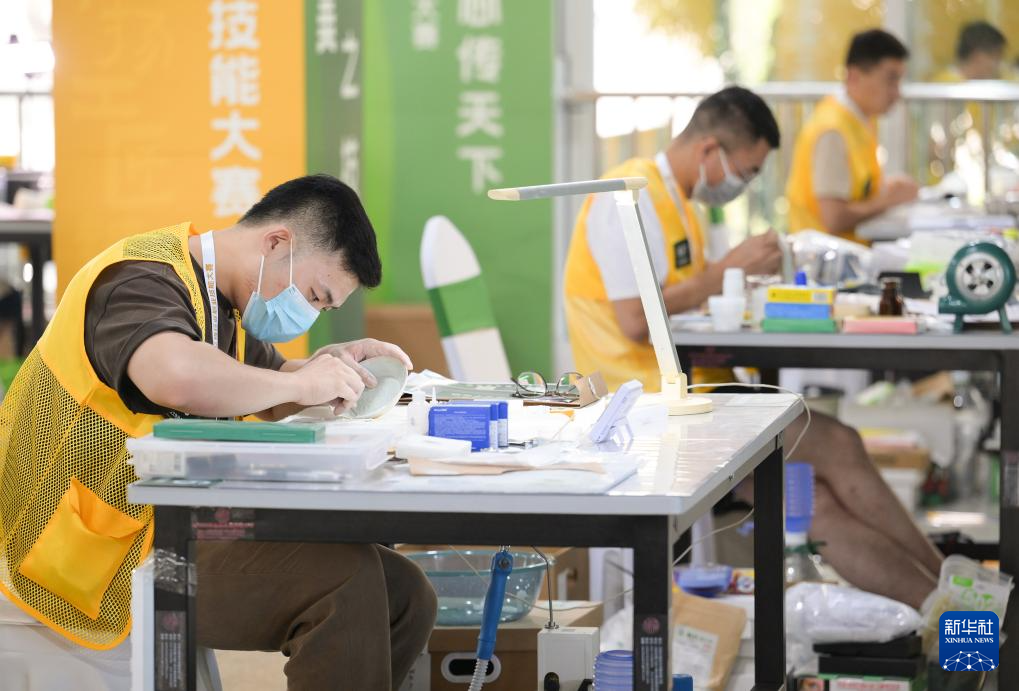 参赛选手在陶瓷文物修复师赛区修复瓷器(7月5日摄)。