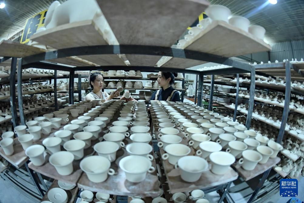8月11日,在成都市彭州白瓷艺术中心制作工坊,工作人员检查泥胚是否变形。