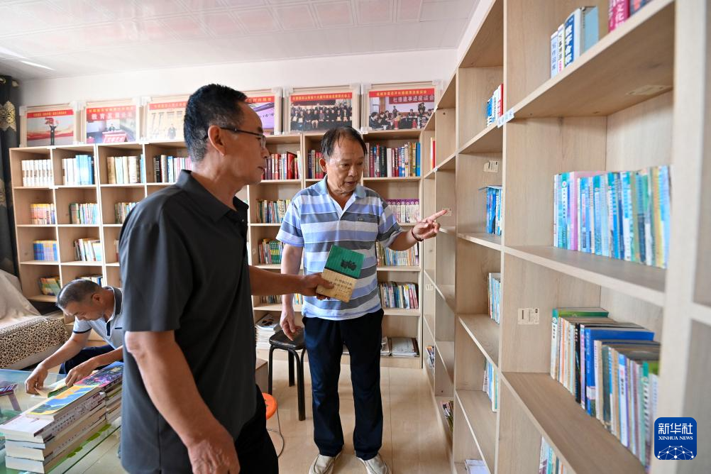 在位于山西省永济市卿头镇张坊村的家庭图书馆内,杜德建(右)为村民挑选图书(9月9日摄)。